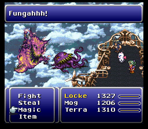 Some characters are balanced more properly. Terra, a magical girl who the story follows when it begins, can transform into a massively powered up state, but there's a time limit for how long she can remain in this state. Mog, a fuzzy Moogle with an attitude, can Dance, which causes random effects of varying strength. You have no direct control over him in this mode, but the Dances are well balanced. Umaro, a yeti, is a very strong attacker who can't learn magic. The fact that a few characters, including some optional ones, are well balanced tells me that Square could have done better if they'd spent a little more time ironing out the kinks in their characters' abilities.
